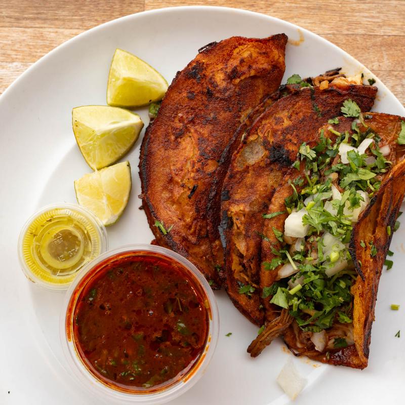 Corn tortillas soaked in consomé broth, stuffed with melted mozzarella cheese and stewed birria meat (beef), freshly chopped onions, and cilantro, then grilled to perfection. Served with consomé for dipping, salsa verde or roja, and limes.